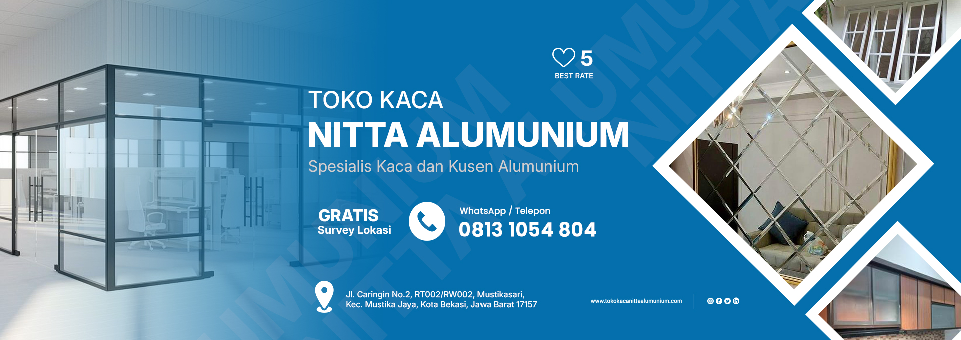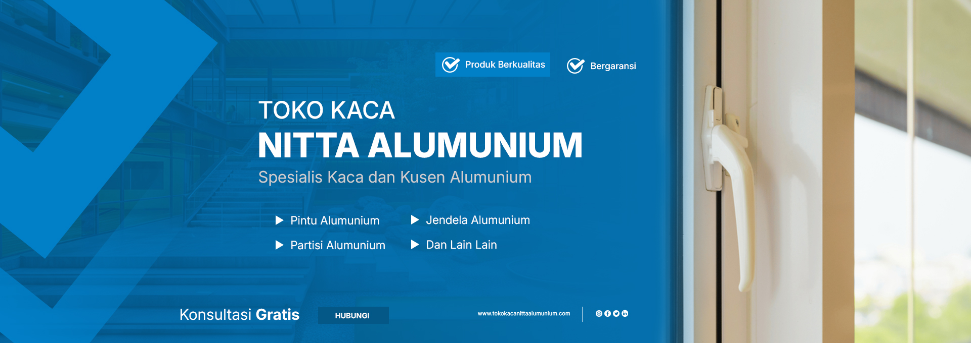 Nitta Alumunium adalah penyedia jasa profesional di bidang pemasangan pintu, kusen, jendela, dan partisi alumunium untuk kebutuhan rumah, kantor, hingga bangunan komersial. Dengan pengalaman dan tenaga ahli berpengalaman, kami berkomitmen memberikan hasil kerja rapi, kuat, dan bernilai estetika tinggi.